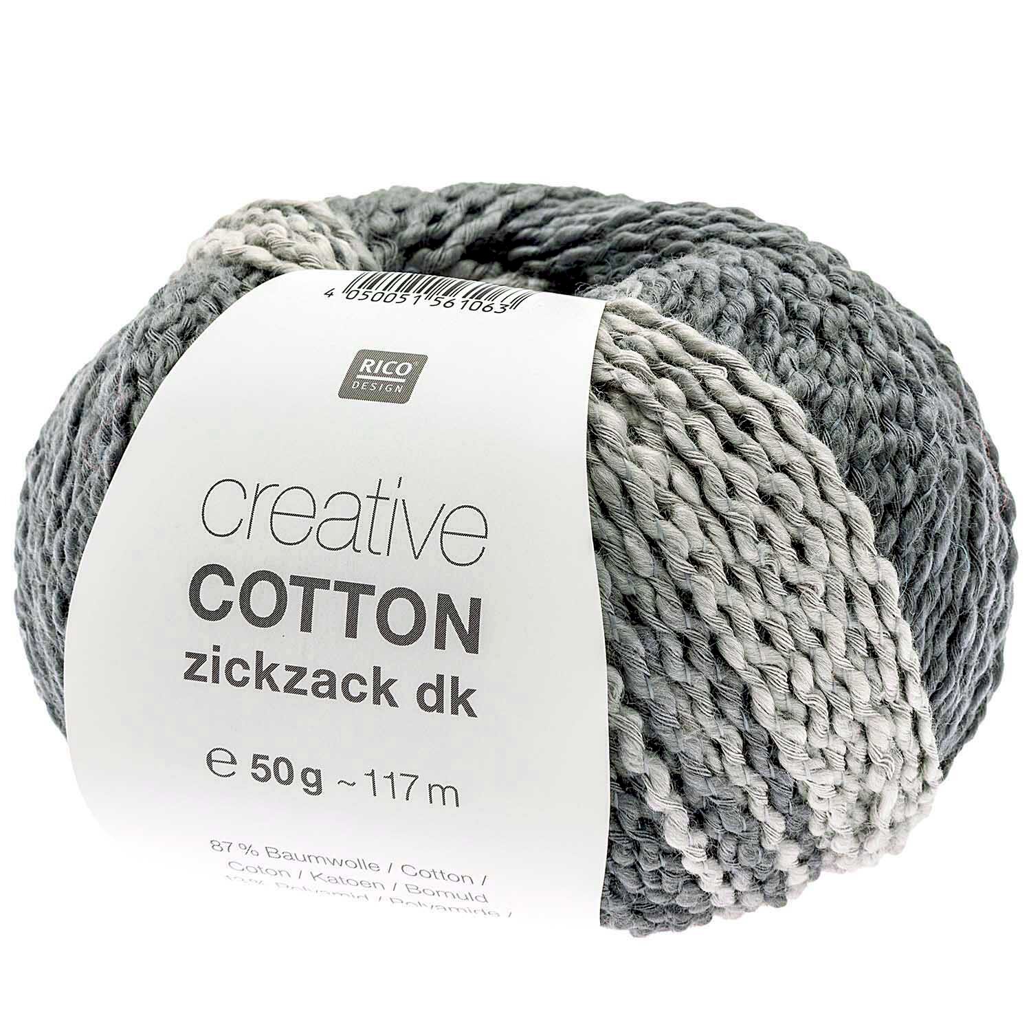 Wie der Name dieses Rico Design Garns bereits erahnen lässt, zeichnet sich die Garnneuheit „Creative Cotton Zickzack“ durch einen Faden mit auffälliger Zickzackstruktur aus. Dieser punktet sowohl im Knäuel als auch verstrickt mit seiner beeindruckenden Optik. Verstrickt entstehen zudem stimmige Farbverläufe.